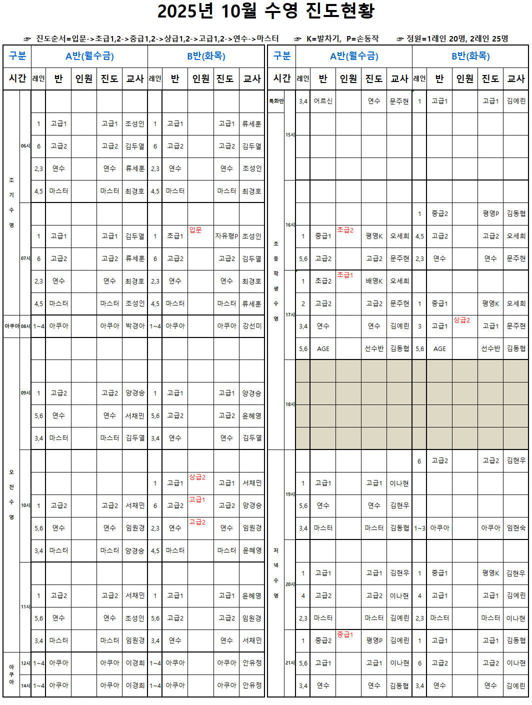 2025년 10월 수영 진도표 안내
