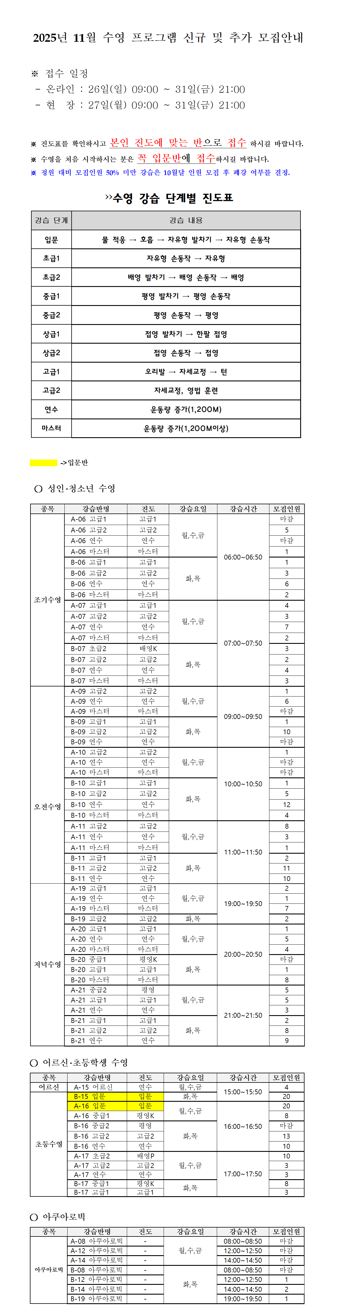 2025년 11월 수영 신규 프로그램 및 추가 모집 안내