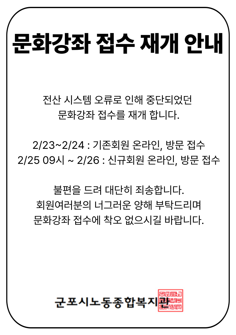 문화강좌 접수 재개 안내